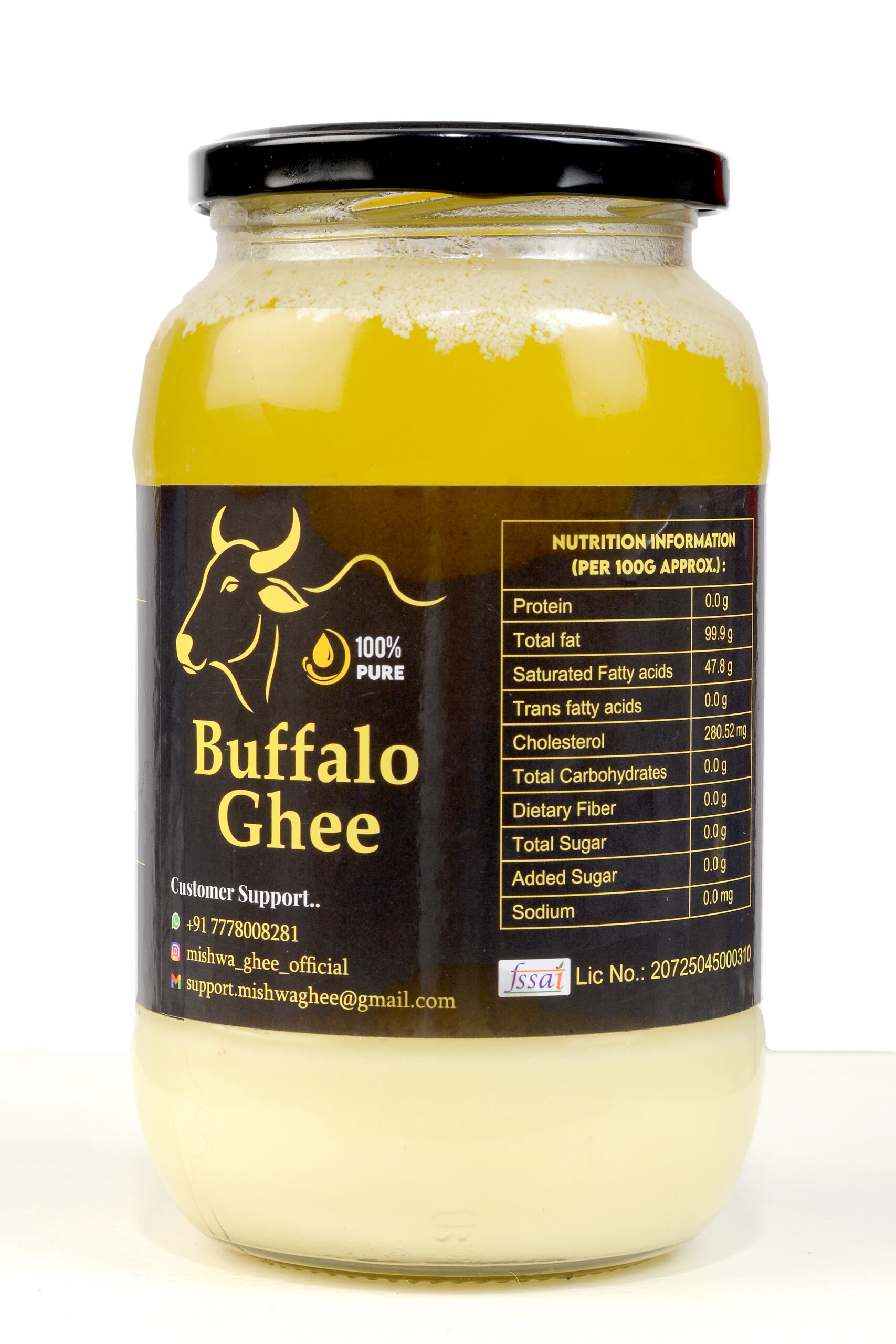 Mishwa Buffalo Ghee is prepared from fresh and pure buffalo milk using age-old traditional methods. Known for its rich flavor, thick texture, and high nutritional value, buffalo ghee is the perfect choice for cooking, frying, and making Indian sweets. It is packed with natural vitamins and healthy fats that support immunity, improve bone strength, and provide long-lasting energy. Enjoy the authentic golden richness of Mishwa Buffalo Ghee – Pure Taste, Pure Trust.